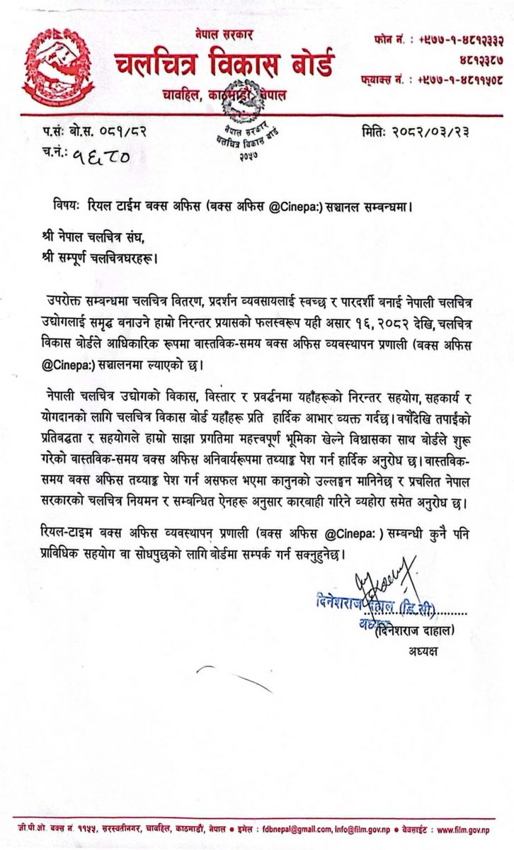 रियल टाइम बक्सअफिसलाई प्रभावकारी बनाउन चलचित्र विकास बोर्डले देशभरका प्रदर्शकलाई अनिवार्यरुपमा बक्सअफिस तथ्यांक पेश गर्न निर्देशन दिएको छ । बोर्ड अध्यक्ष दिनेश डिरीले असार २३ गते देशभरका प्रदर्शकलाई पत्र लेख्दै यस्तो निर्देशन दिएका हुन् ।